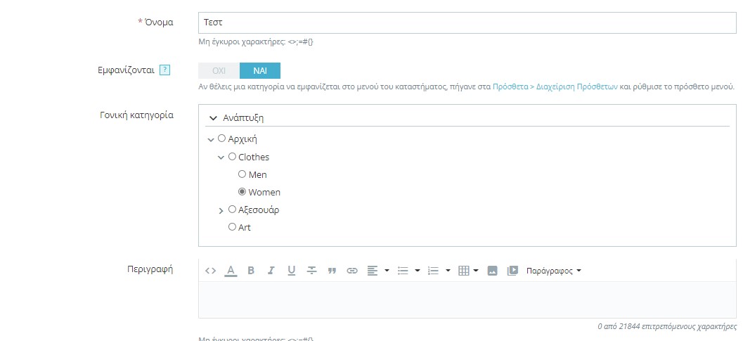 Επιλέγουμε αν η κατηγορία μας είναι κεντρική ή ανήκει σε κάποια άλλη κατηγορία