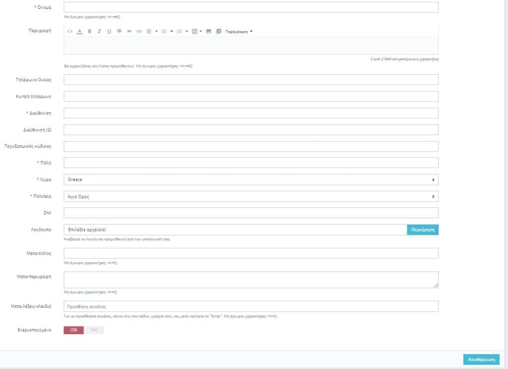 Εισάγουμε στοιχεία προμηθευτή όπως όνομα διεύθυνση. Προσοχή στα πεδία που είναι υποχρεωτικά. Από τις ρυθμίσεις του Prestashop μπορούμε να επιλέξουμε να μη φαίνεται δημόσια ο προμηθευτής μας.